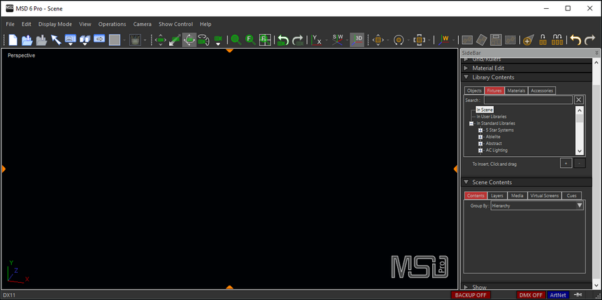 If you expand the 'Library Content' section in the sidebar, you will notice that the 'Objects', 'Fixtures' and 'Materials' lists have 3 sections: 'In Scene', 'In User Libraries' and 'In Standard Libraries'. The 'In Scene' section contains the objects, fixtures and materials that are used in this scene file, and so are empty for now. When you first start using MSD, you will not have any user libraries, so the 'In User Libraries' also be empty The 'In Standard Libraries' section will show the objects, fixtures and materials that are available in the standard libraries.