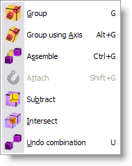 Operation | Combine | Group using Axis Shortcut: ALT+G This option allows you to group the selected objects together. The resulting group can be treated as a single object from then on. Such a group can always be split again by picking it and selecting the 'UnGroup' operation.